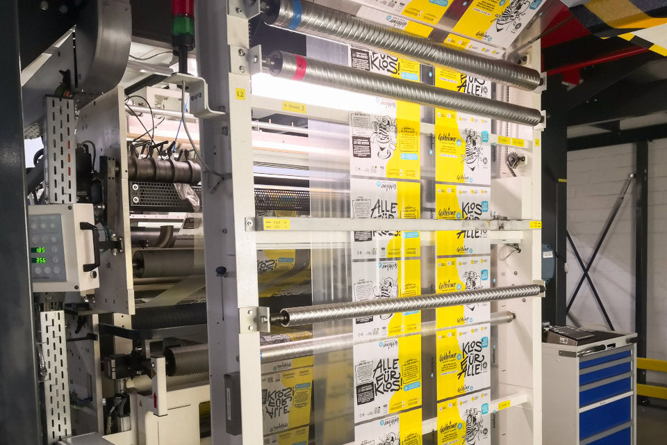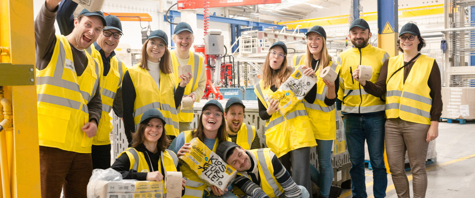In August 2023, the first tests with WILDPLASTIC® material were carried out together with the partners Bischof & Klein and WEPA and in the same month (how cool is that?!) the first Goldeimer packaging with WILDPLASTIC® was produced. Of course, both we and Goldeimer visited the factory for this important day.