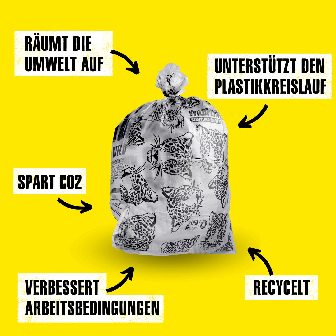 We design all WILDPLASTIC® products (e.g. our WILDBAG) so that they can be recycled. In practice, however, this does not mean that this actually happens, and as always, the whole thing is a little more complicated. There are about a million reasons why this is the case. For example, residual waste is almost always incinerated in Germany. For cost reasons, for example, it is usually not worth sorting out and cleaning the garbage bags beforehand in order to recycle them.
