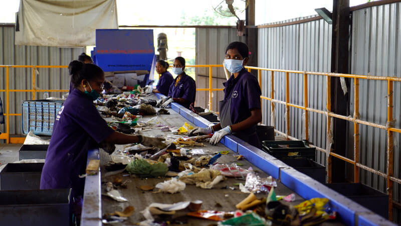 In Ländern ohne ausreichende Abfallmanagementsysteme, wie Indien und Indonesien, wird das wilde Plastik von Sammler*innen gesammelt und sortiert. Anschließend wird das Material gewaschen und zerkleinert.